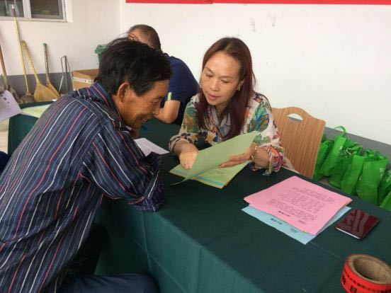 志愿者為農村剩余勞動力介紹潔霸公司招工簡章 村民們認真閱讀招工簡章。