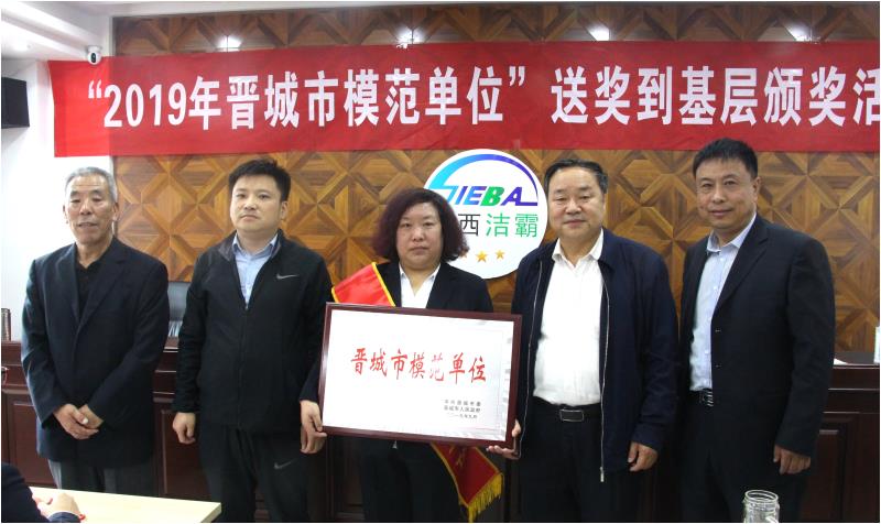 公司副總經理史志霞首先介紹了公司的基本情況。隨后市總工會商貿工會主席張玉濤宣讀了晉城市潔霸清潔公司榮獲“2019年晉城市模范單位”批復表彰文件,市總工會副調研員刁忠孝向公司副總經理史志霞授帶頒獎,并頒發了獲獎榮譽證書。