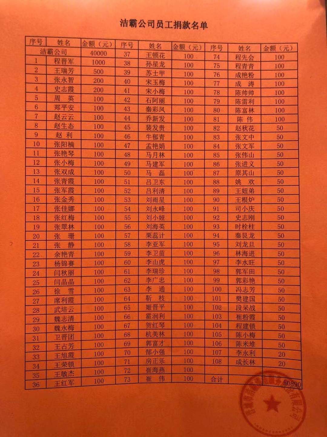 捐款倡議書在“潔霸一家人”群發布后,大家踴躍參與。公司班子成員率先垂范,帶頭捐款,全體干部員工勠力同心,慷慨解囊,凸顯了潔霸人的責任與擔當。