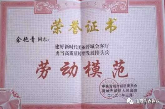 余艷青同志自2015年進(jìn)入潔霸以來,一直奮斗在工程部的第一線從事主管工作。工作中,余艷青同志愛崗敬業(yè),遵守職業(yè)道德,為人誠實(shí)守信;她熱愛工作,對(duì)待客戶熱情周到、耐心細(xì)致;工作中團(tuán)結(jié)同事,責(zé)任心強(qiáng),吃苦耐勞,服從大局,以公司的利益為重。在我市開展的“三洗六見一紅旗”活動(dòng)和全國文明城市的創(chuàng)建活動(dòng)中,她帶領(lǐng)員工高標(biāo)準(zhǔn)、高質(zhì)量、高效率地完成清洗美化工作,為扮靚晉城形象,打造城市優(yōu)美環(huán)境做出了突出貢獻(xiàn)。先后多次被公司評(píng)為優(yōu)秀員工等,2019年在公司成立20周年慶之際,她又被公司授予“潔霸工匠”稱號(hào)。