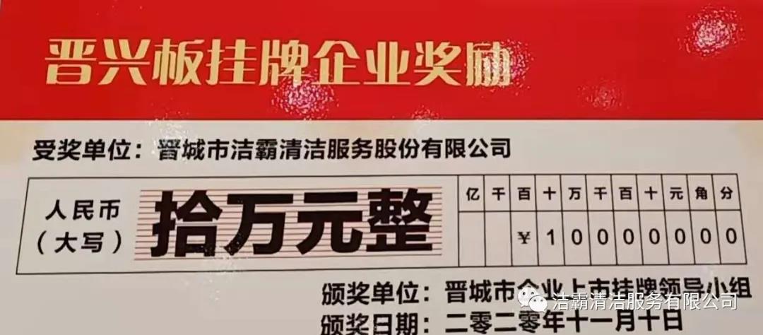 晉城市潔霸清潔服務(wù)股份有限公司于2019年11月27日成功登陸山西股權(quán)交易中心“專精特新板”(晉興板)(企業(yè)代碼:060200Z),是“專精特新板”開板暨首批掛牌的14家企業(yè)之一。“專精特新板”是山西股權(quán)交易中心設(shè)立的特色板塊,為省內(nèi)具備專業(yè)化、精細(xì)化、特色化、新穎化的優(yōu)質(zhì)企業(yè)提供專屬服務(wù),成為帶動(dòng)全省中小企業(yè)創(chuàng)新創(chuàng)造、轉(zhuǎn)型升級(jí),壯大工業(yè)高質(zhì)量發(fā)展的生力軍。“晉興板”掛牌,標(biāo)志著公司正式進(jìn)軍資本市場(chǎng),豐富了融資渠道,推動(dòng)公司高質(zhì)量轉(zhuǎn)型發(fā)展,成為公司發(fā)展的新引擎。
