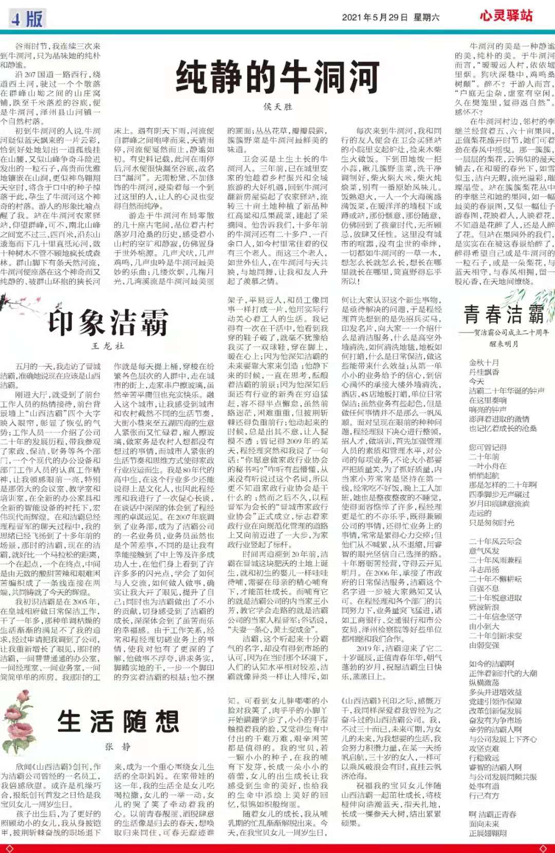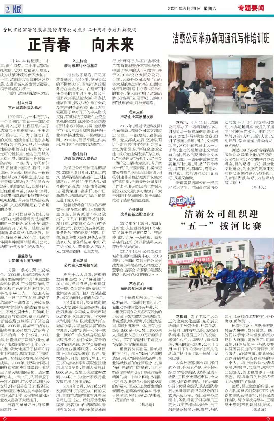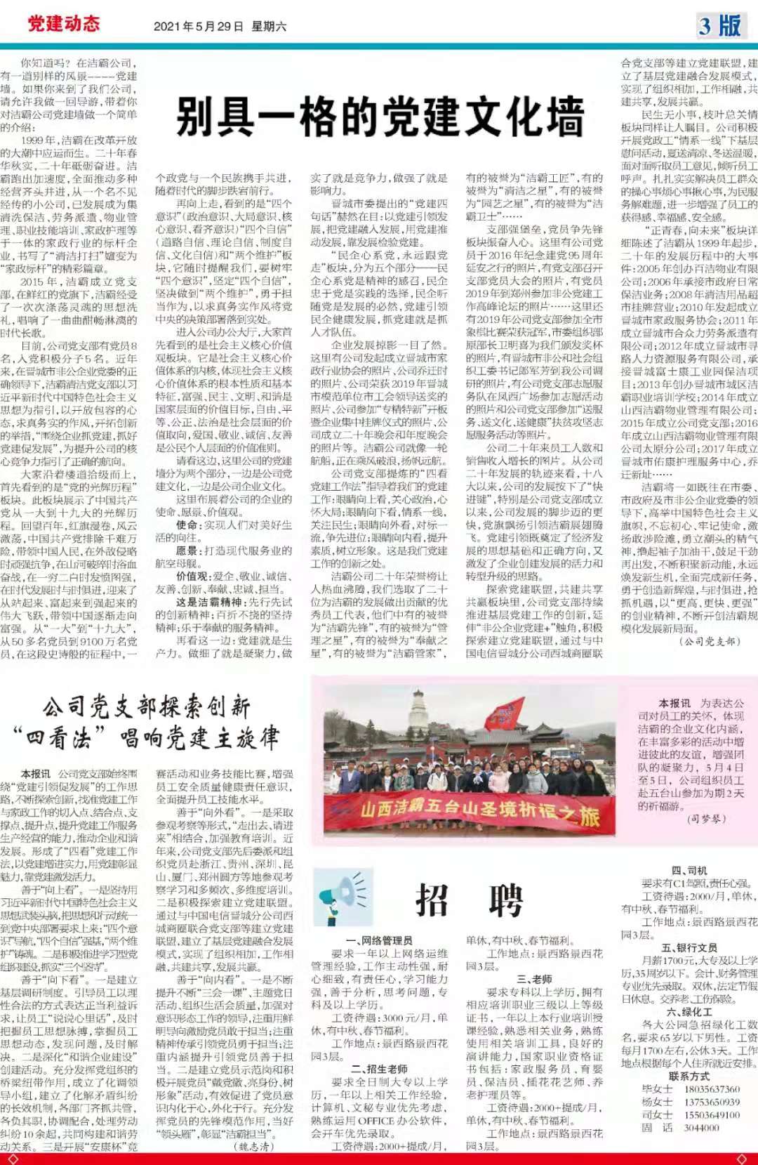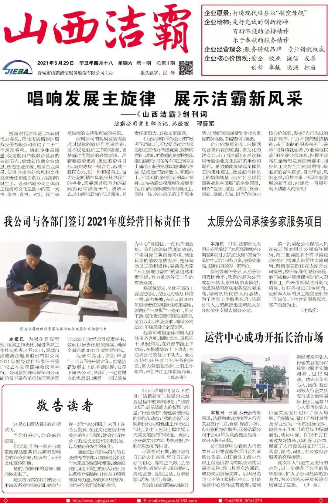 今天是2021年5月29日,經過一個多月的緊張籌辦,《山西潔霸》報紙終于創刊啦!這是潔霸人的一件大喜事,也是潔霸人的驕傲!伴隨著《山西潔霸》紙質版的內部發行,電子版也同步與你見面了。希望你能通過這個宣傳窗口,更好地走近潔霸,了解潔霸,關注潔霸,支持潔霸。