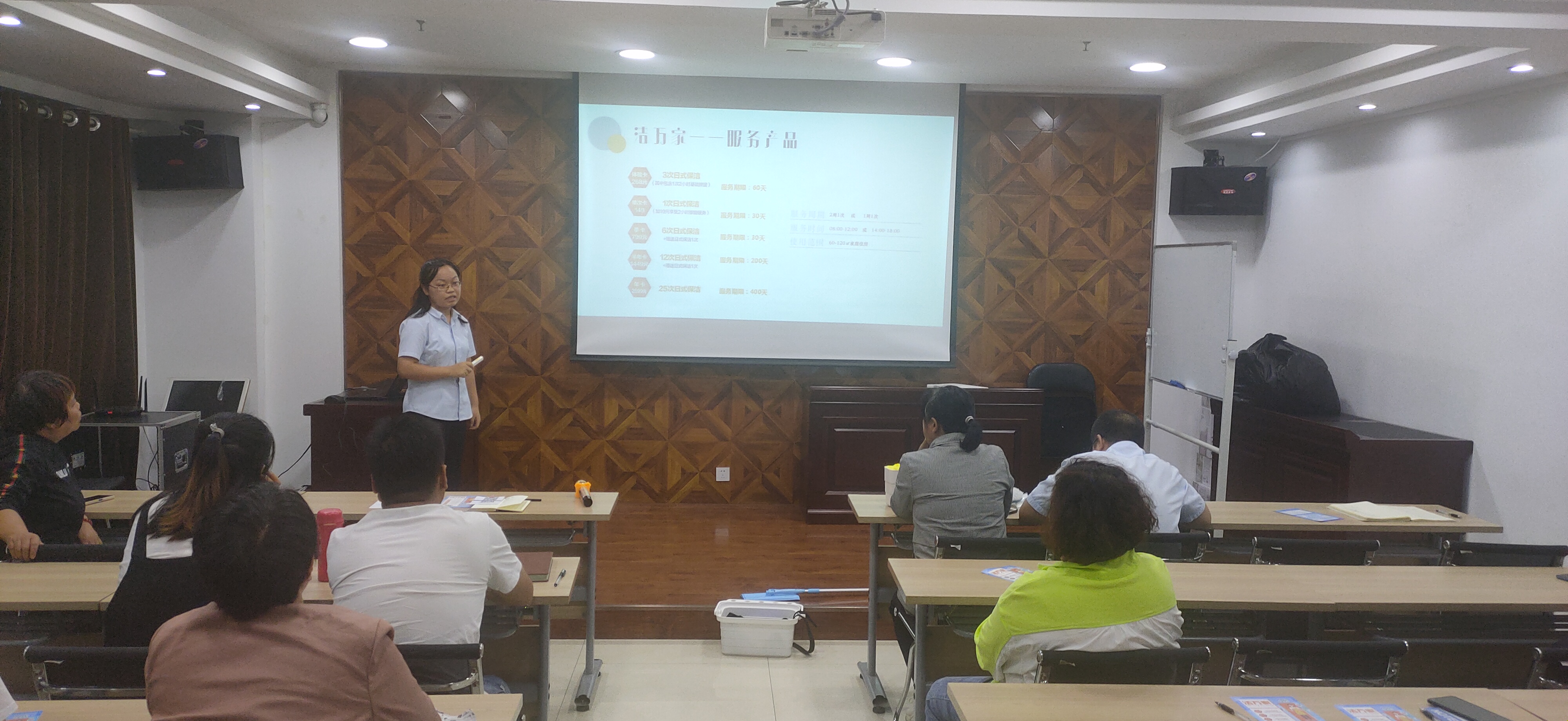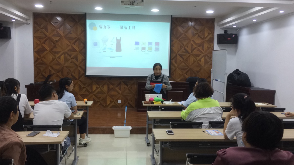 隨后由公司人力資源部負責人司夢琴對“潔萬家”日常保潔產品進行了分類介紹,此外還介紹了產品推廣獎勵方案和推廣話術,對大家日后推廣過程中會遇到的客戶提出的各種問題進行了預設并一一詳細作答。