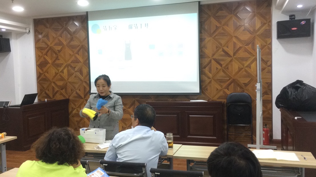 會議開場,從福建福州取經回來的人力資源部呂利清用簡短的一句話首先點出了“潔萬家”產品的亮點——“1人1次4小時日常保潔服務”,接著她從服務人員、服務時間、服務內容、保潔工具、保潔流程等方面介紹了“潔萬家”日常保潔與年關保潔以及居家保潔的區別,并對服務內容所涵蓋的6大區域(臥室、衛生間、餐廳、客廳、廚房、陽臺)以及專用8色保潔布的分類使用進行了詳細的介紹。