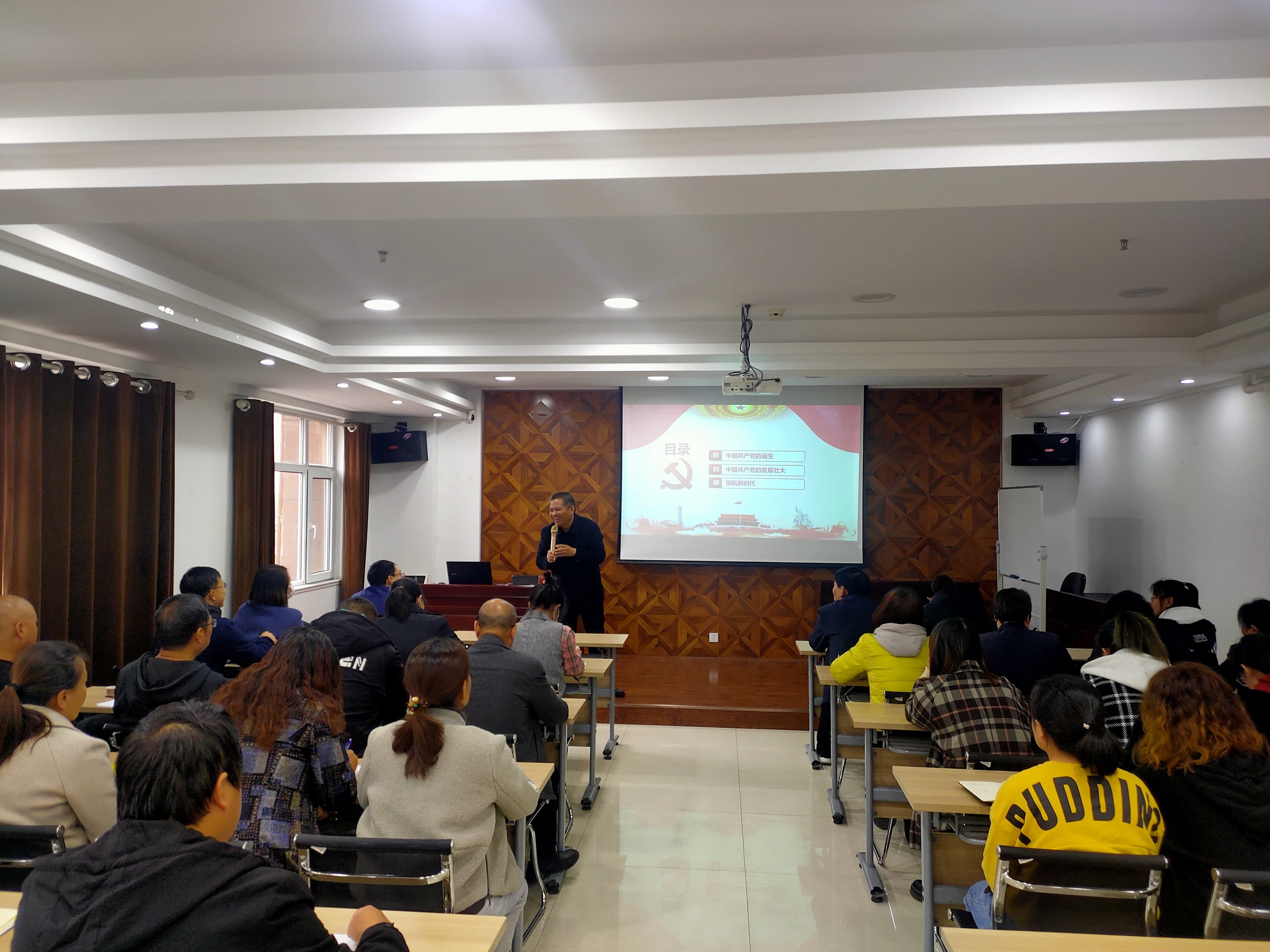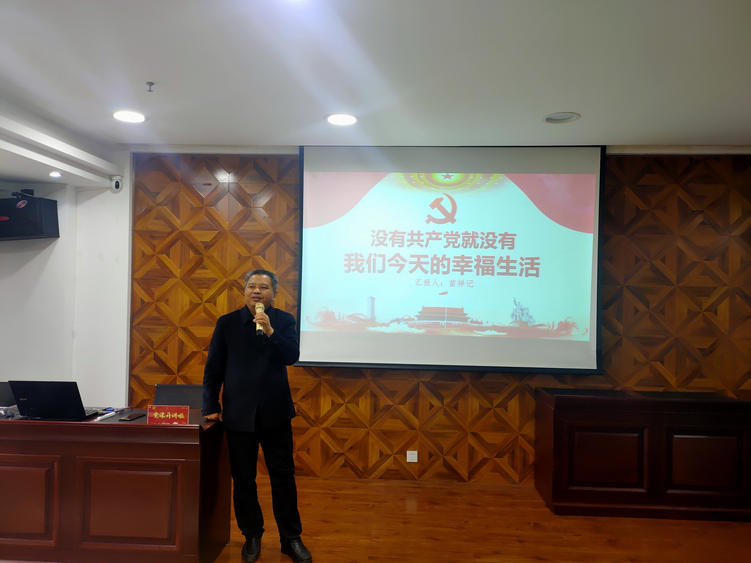 黨課中,苗祥記校長以“沒有共產黨就沒有我們今天的幸福生活”為主題,從1901年清政府簽訂喪權辱國的《辛丑條約》講起,引用大量翔實、生動的歷史資料,對“十月革命”、中國共產黨的誕生、創建井岡山革命根據地、遵義會議、中共中央在延安、中共七大、中共建設社會主義的偉大成就等歷史場景為大家作了系統全面的講解,全景式展現了中國共產黨的誕生、歷經淬煉而逐步發展、成熟、壯大以及領航新時代的的偉大歷程,闡述了中國共產黨的初心、使命和宗旨,讓與會人員更直觀更深刻認識到沒有共產黨就沒有我們今天的幸福生活,經受了一次深刻的紅色文化洗禮。