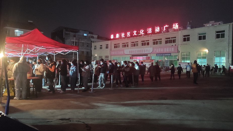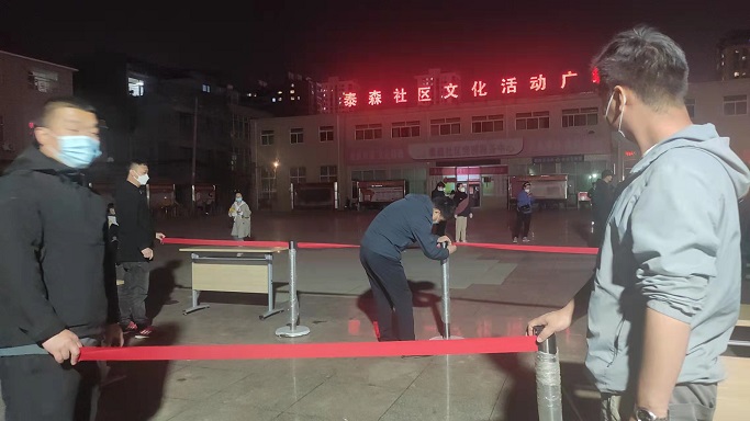 在泰森社區文化活動廣場,志愿者們擺桌子、拉警戒線、撐帳篷,齊心合力協助社區工作人員完成核酸檢測采樣點位設置及物資配備,同時積極引導社區居民進行掃碼登記、測量體溫,提醒社區居民全程佩戴口罩,在排隊期間保持一米間距,組織居民做好分組,提前亮碼,核酸檢測完成后有序離場。雖然天氣較冷,但志愿者們毫無怨言,服務熱情很高,直至晚上12點,協助社區完成了9000余人的核酸檢測工作。