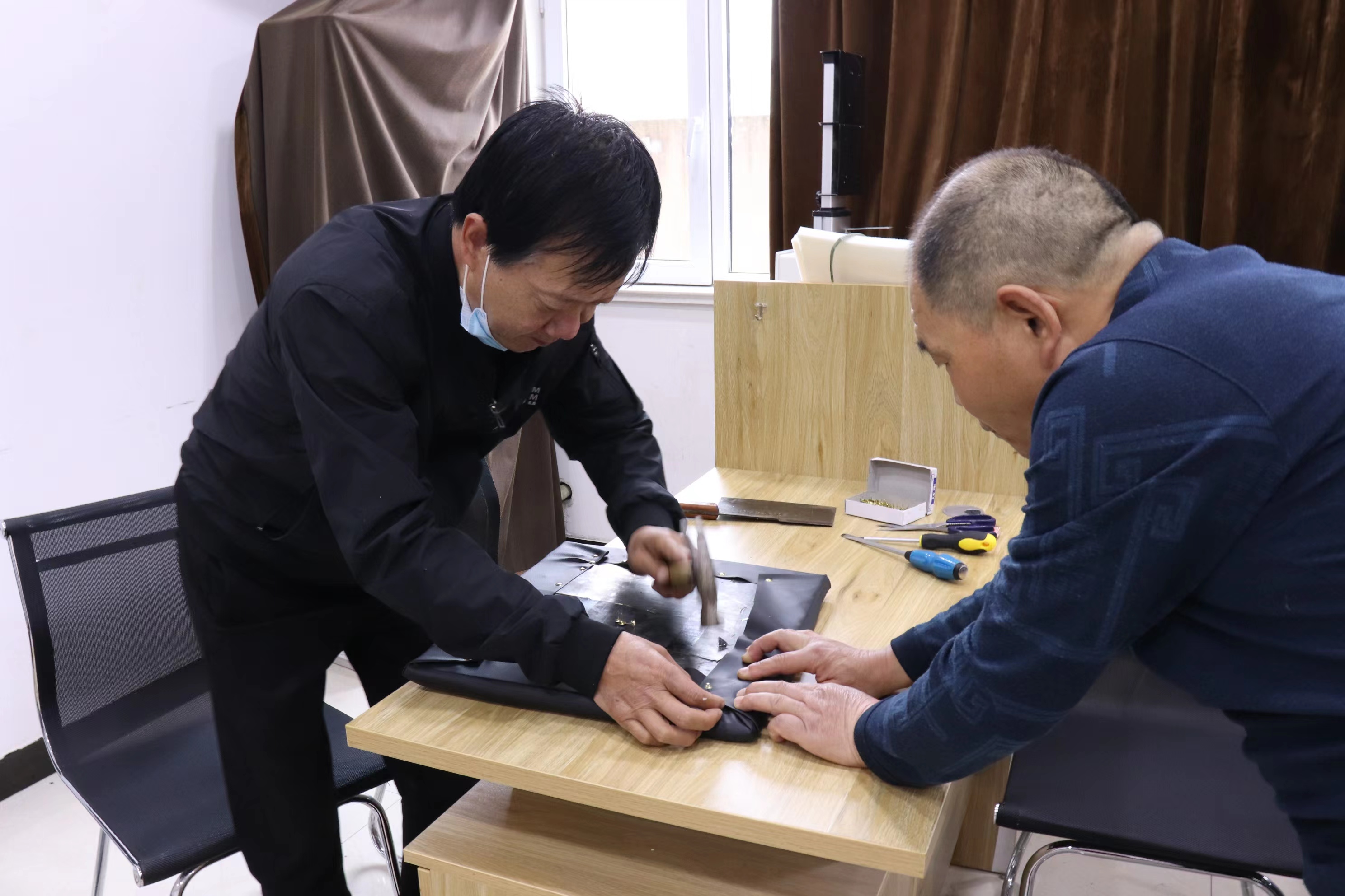 說干就干。他們買來了海綿 、面料 、釘子,憑借衛(wèi)師傅以前的木工技術(shù)和田師傅現(xiàn)有的維修技能,對破損的椅子進行了集中維修。叮叮當(dāng)當(dāng)……敲敲打打,手腳并用,不亦樂乎……