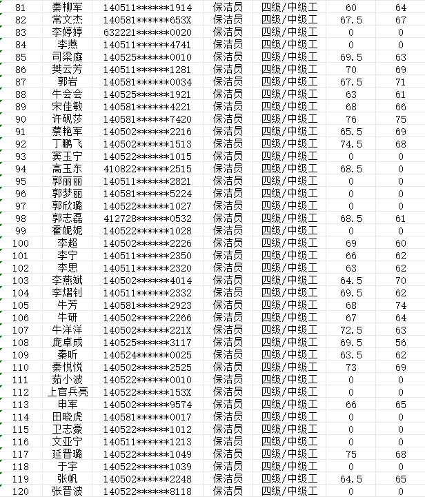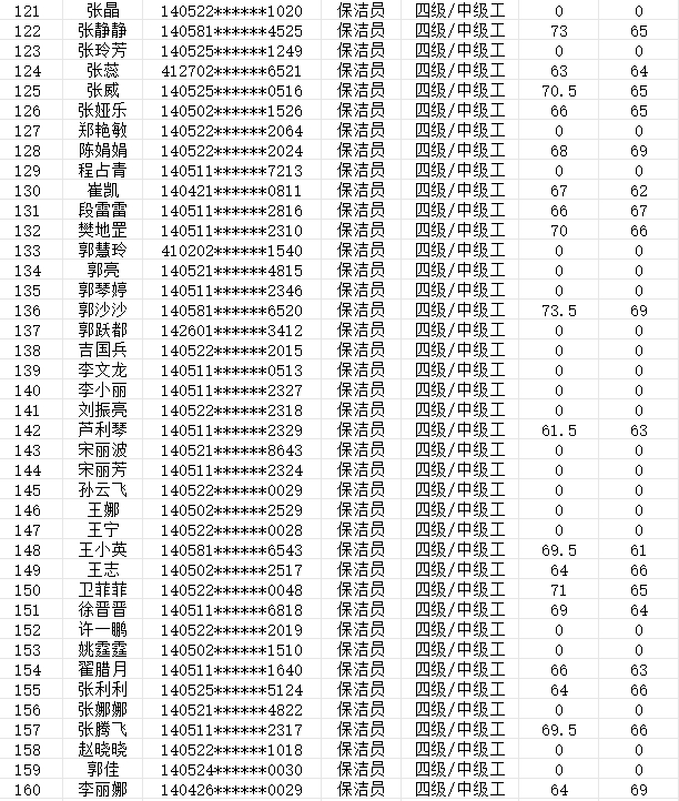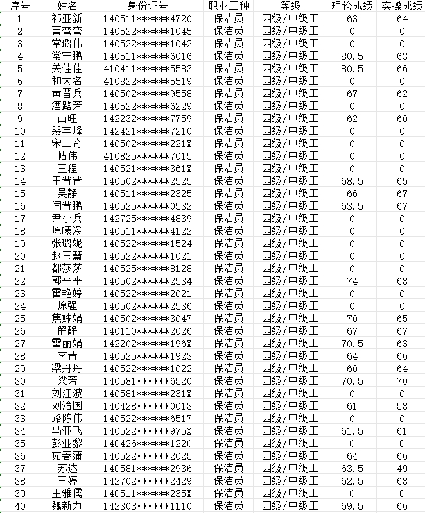 晉城市潔霸清潔服務股份有限公司職業技能等級認定中心現將2024年2月3日認定人員成績公示如下:
