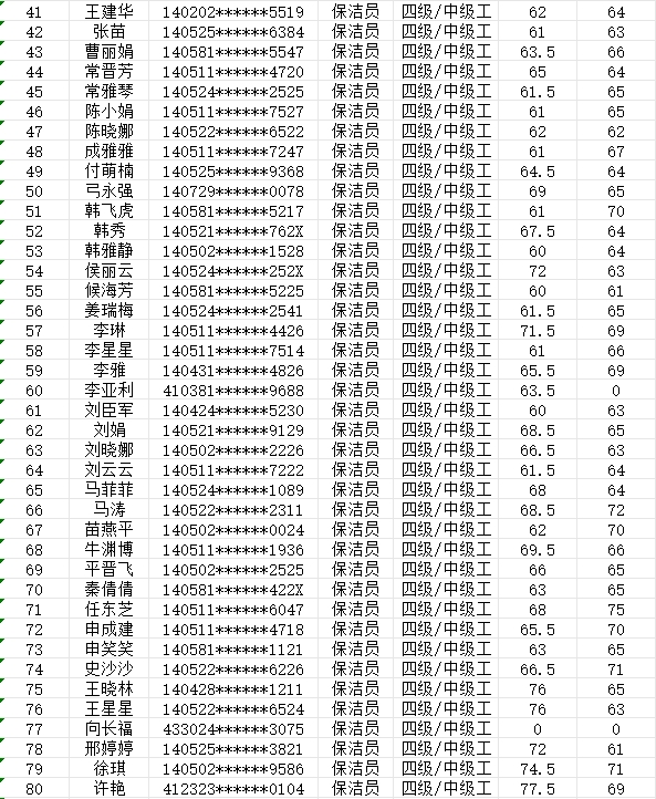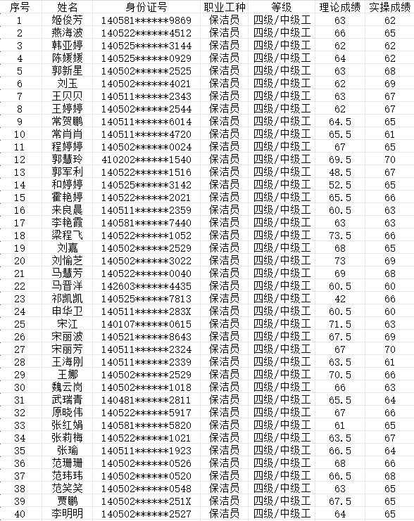 晉城市潔霸清潔服務股份有限公司職業技能等級認定中心現將2024年2月25日認定人員成績公示如下: