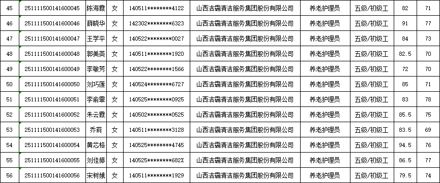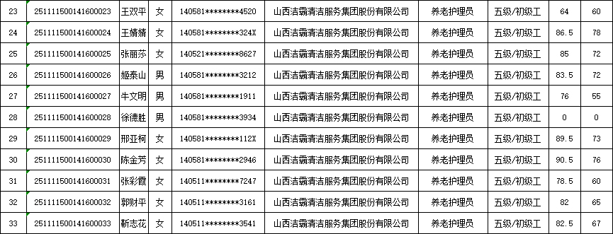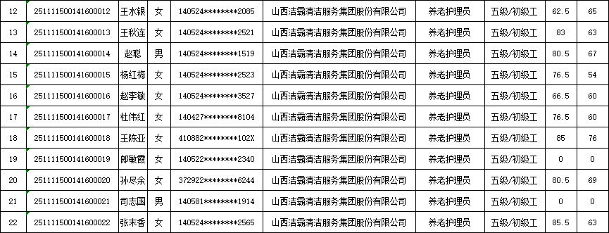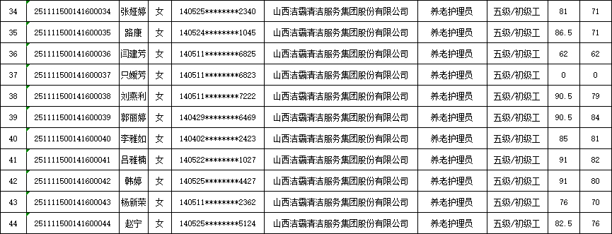 山西潔霸清潔服務集團股份有限公司職業技能等級認定中心現將2025年11月15日認定人員成績公示如下: