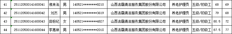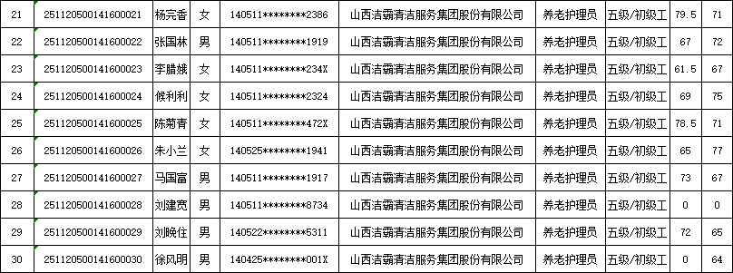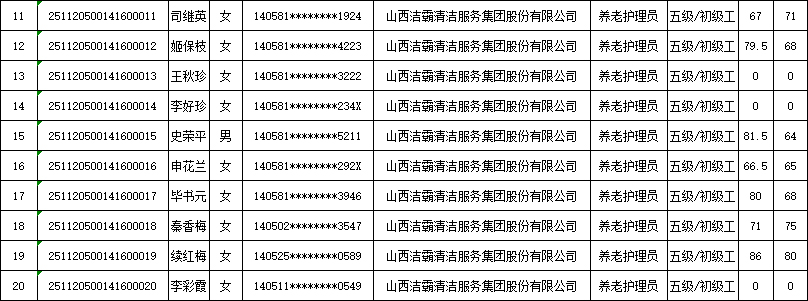 山西潔霸清潔服務集團股份有限公司職業技能等級認定中心現將2025年11月22日認定人員成績公示如下: